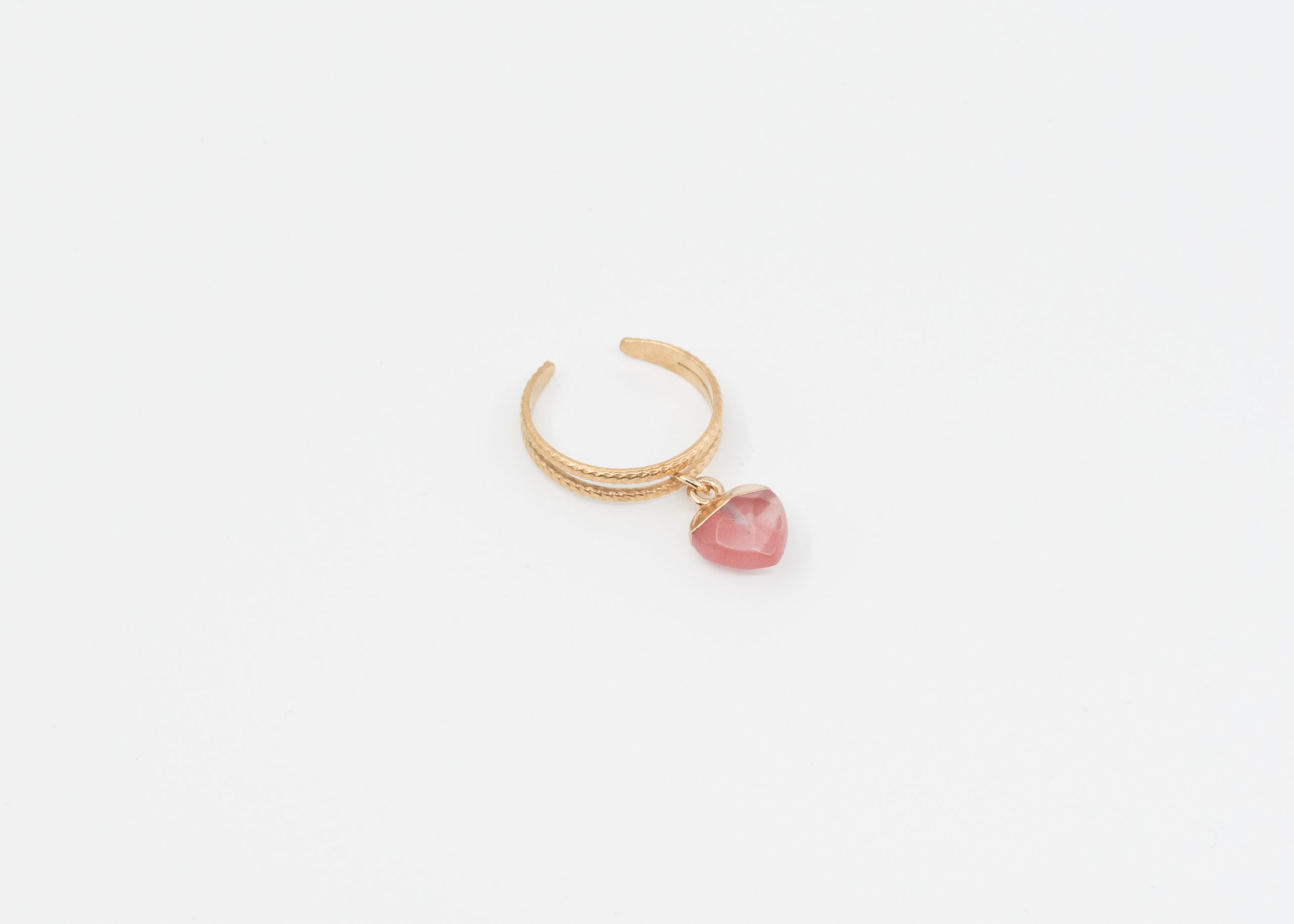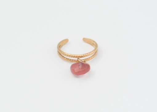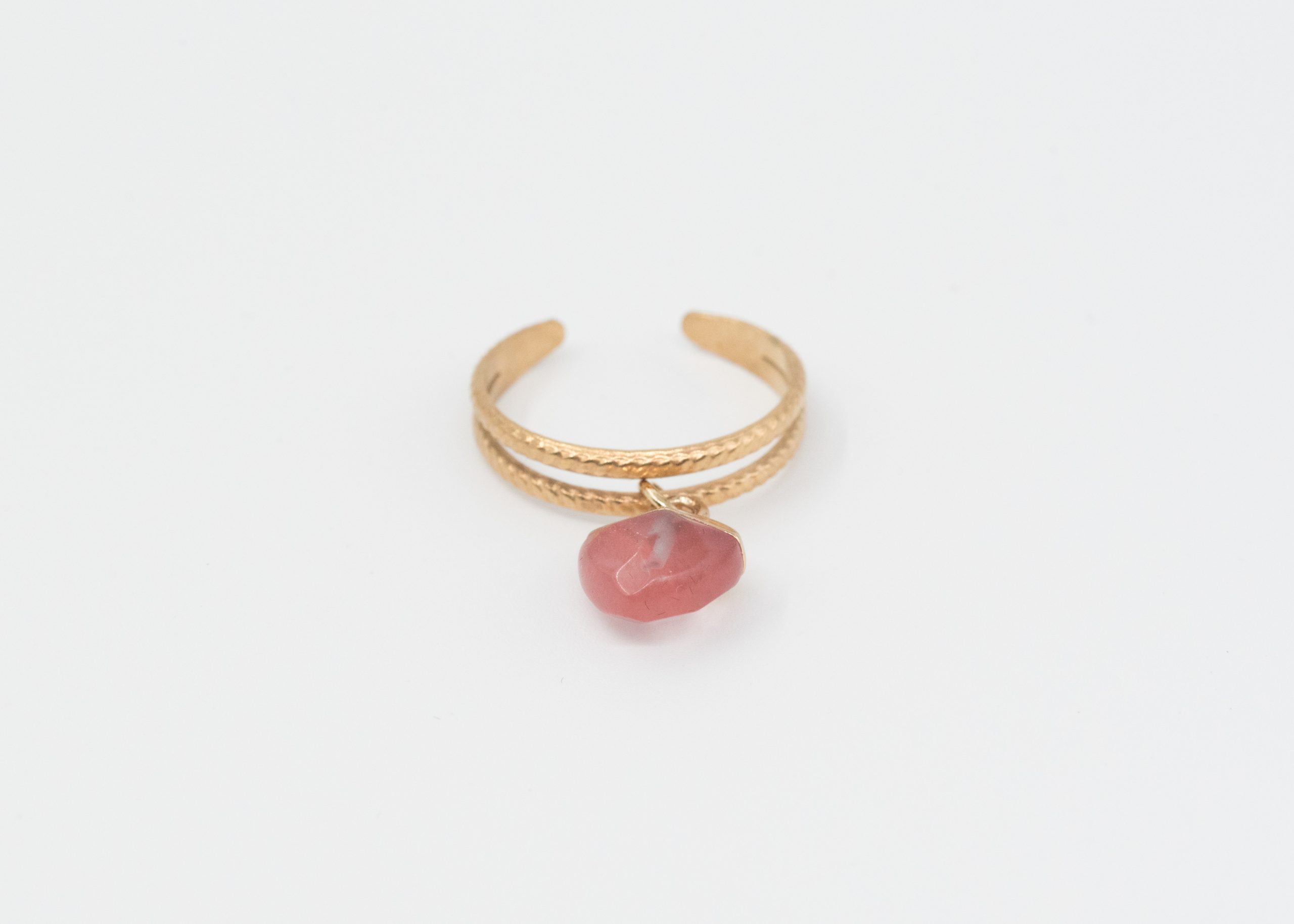 - Bague ajustable dorée torsadée sur 2 anneaux et ornée d’une pierre rosée.