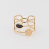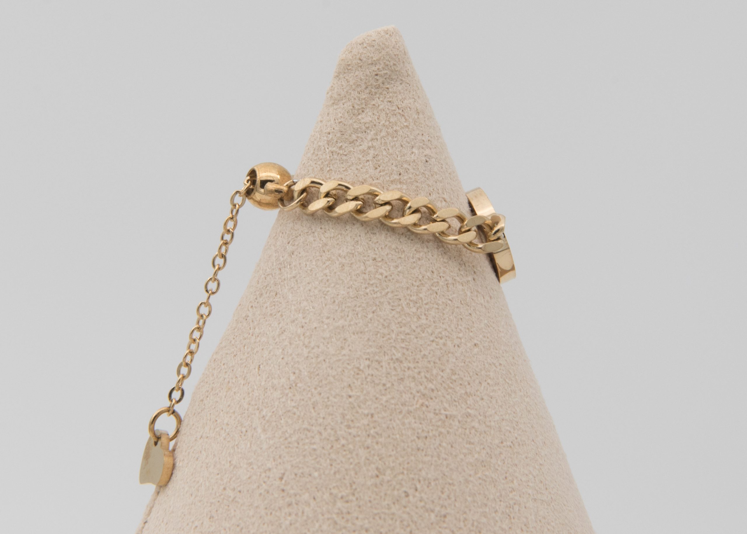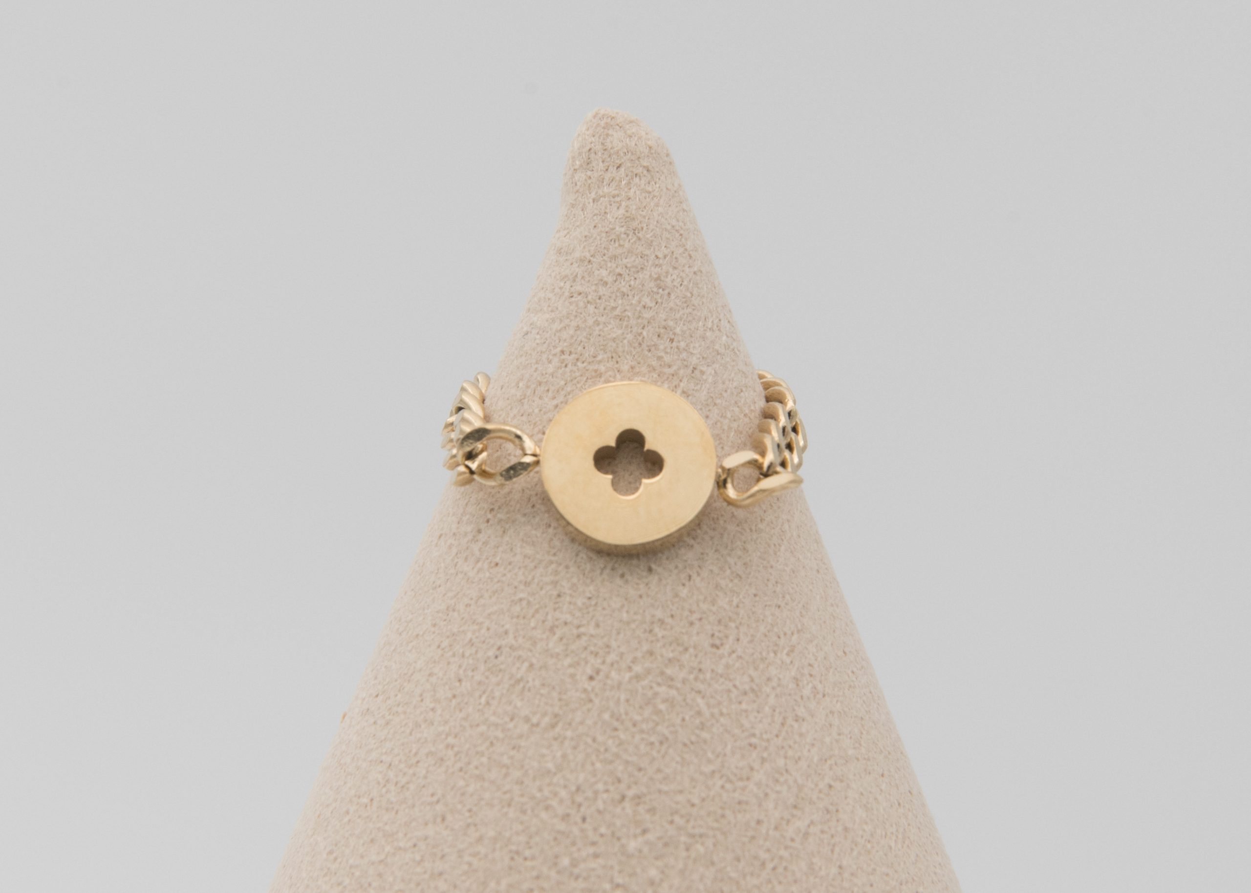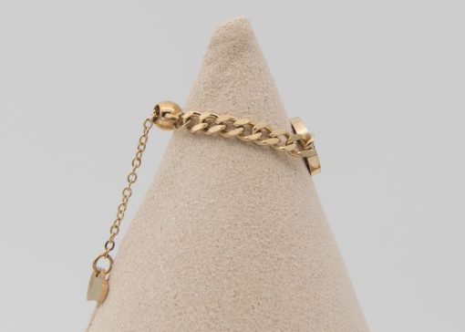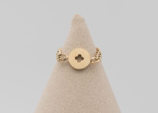 - Bague ajustable dorée : une chaîne fine de type cubaine avec une médaille décorée d’un trèfle en son centre.