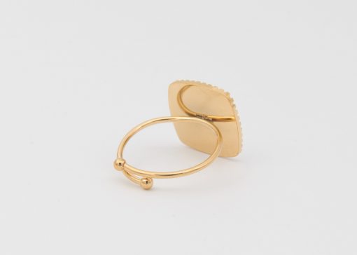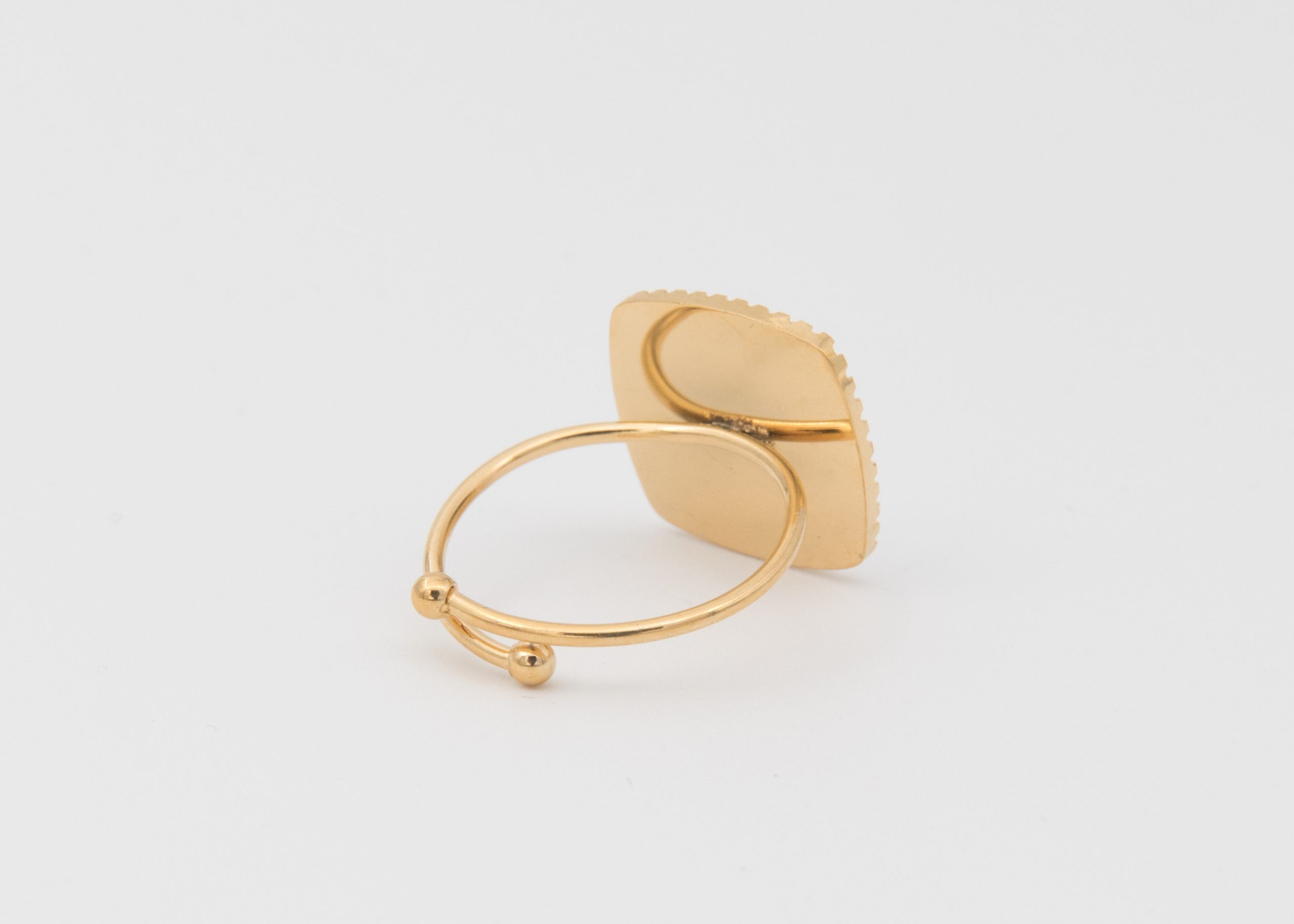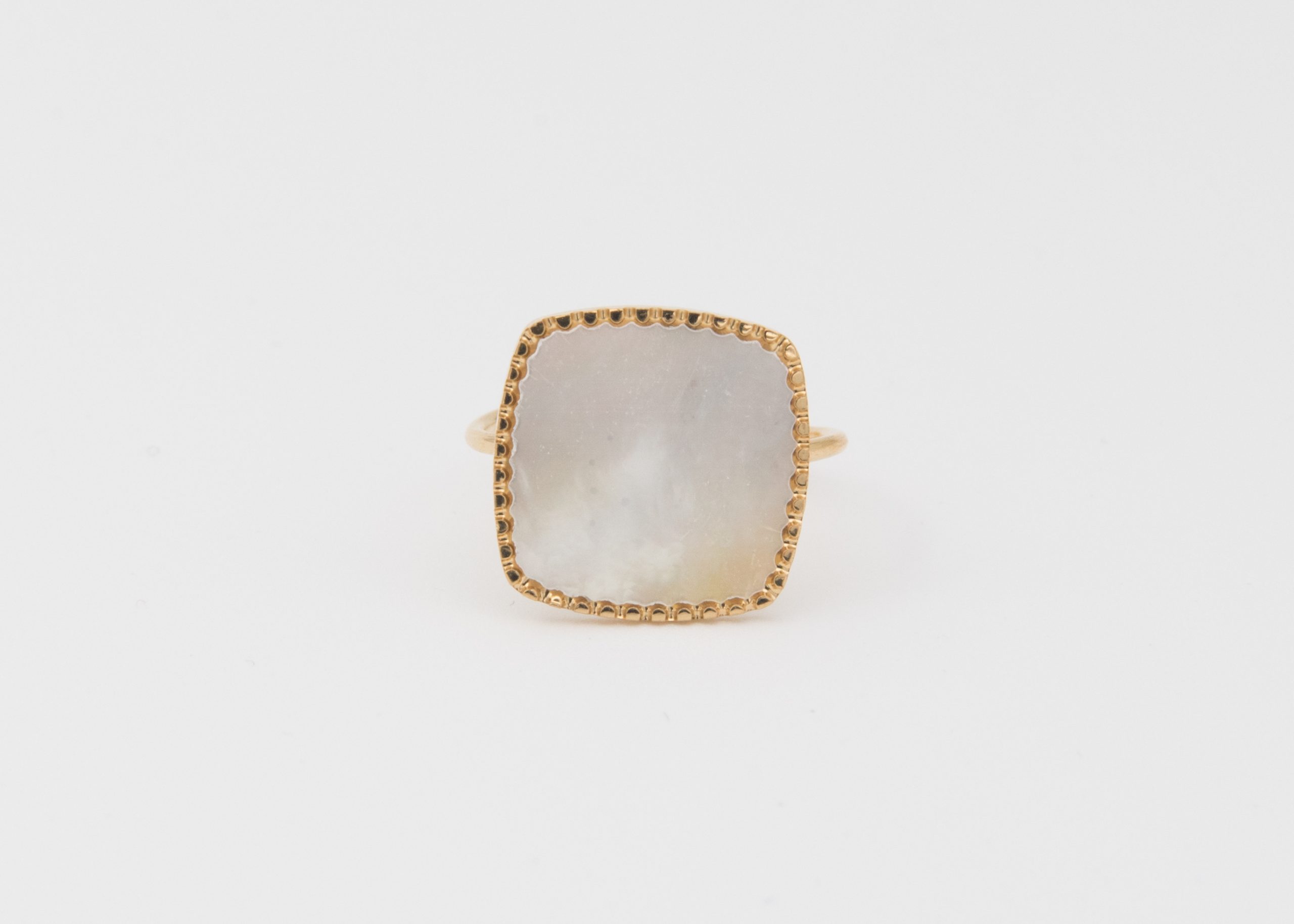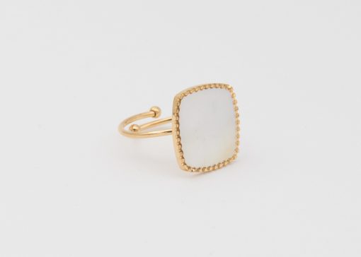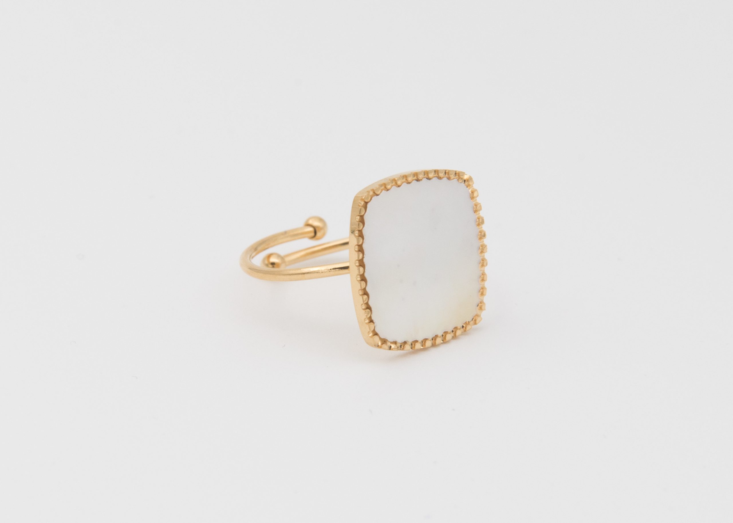 - Bague ajustable dorée avec une nacre blanche ornée d’un contour torsadé.