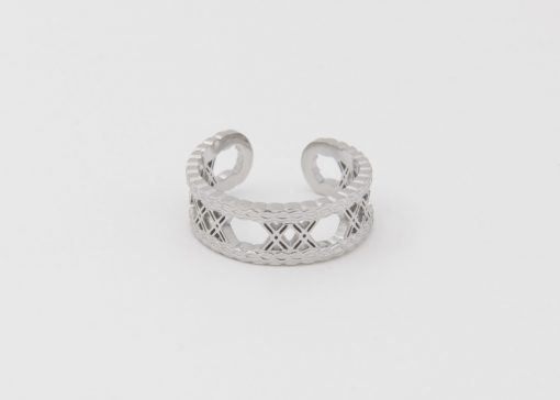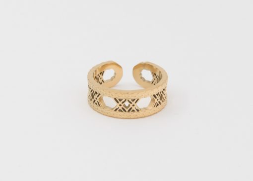 - Bague ajustable dorée ou argentée sculptée sur sa surface extérieure avec de jolis croisillons en son centre.