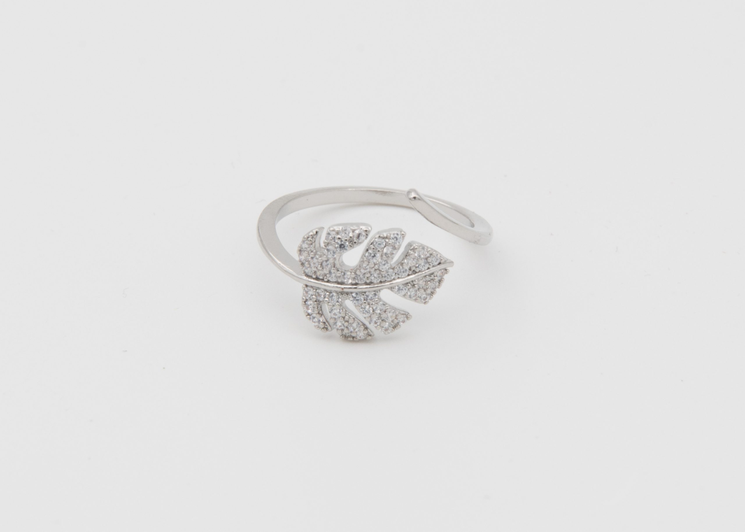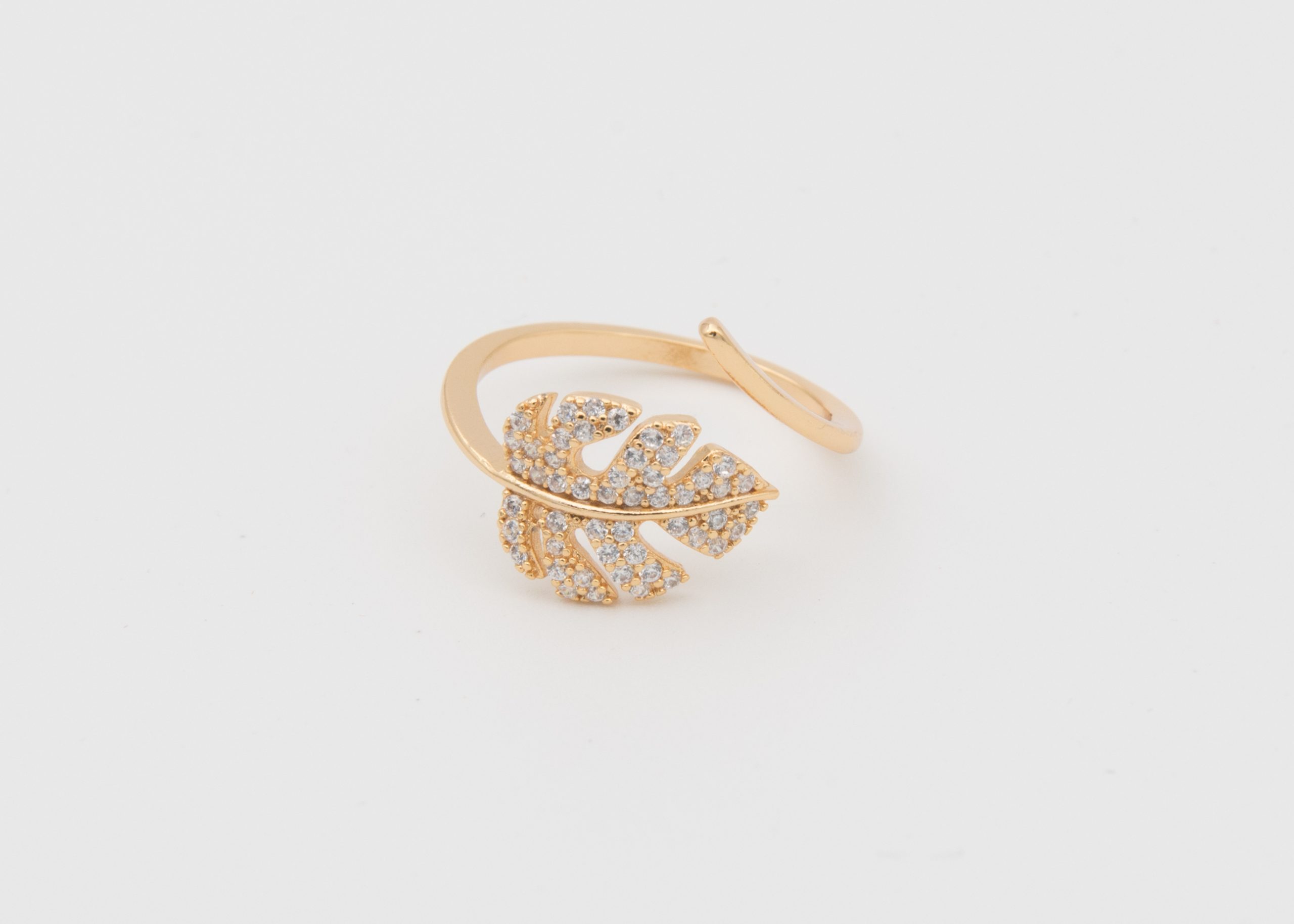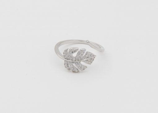 - Bague ajustable, dorée ou argentée, avec une belle feuille de monstera recouverte de strass blancs.