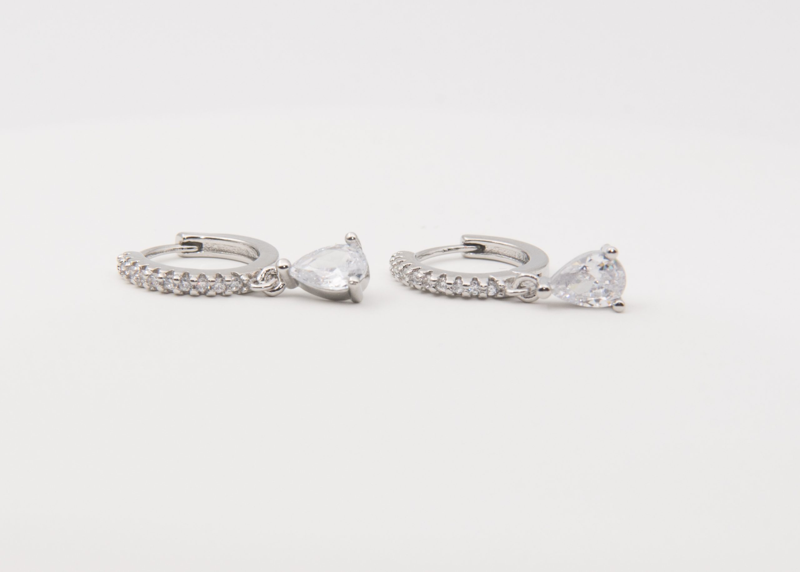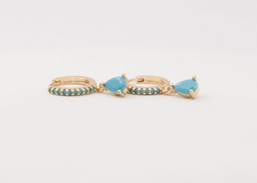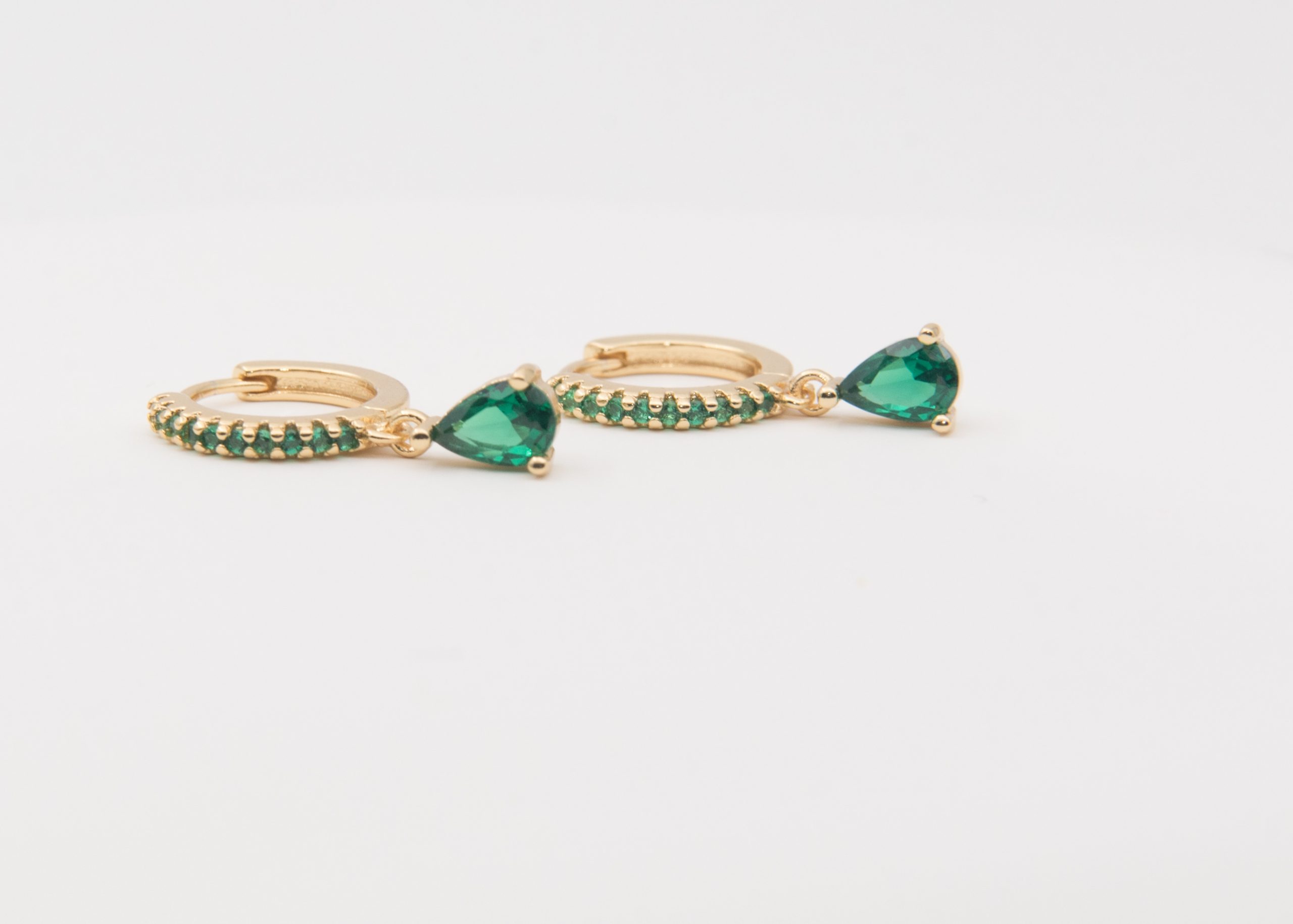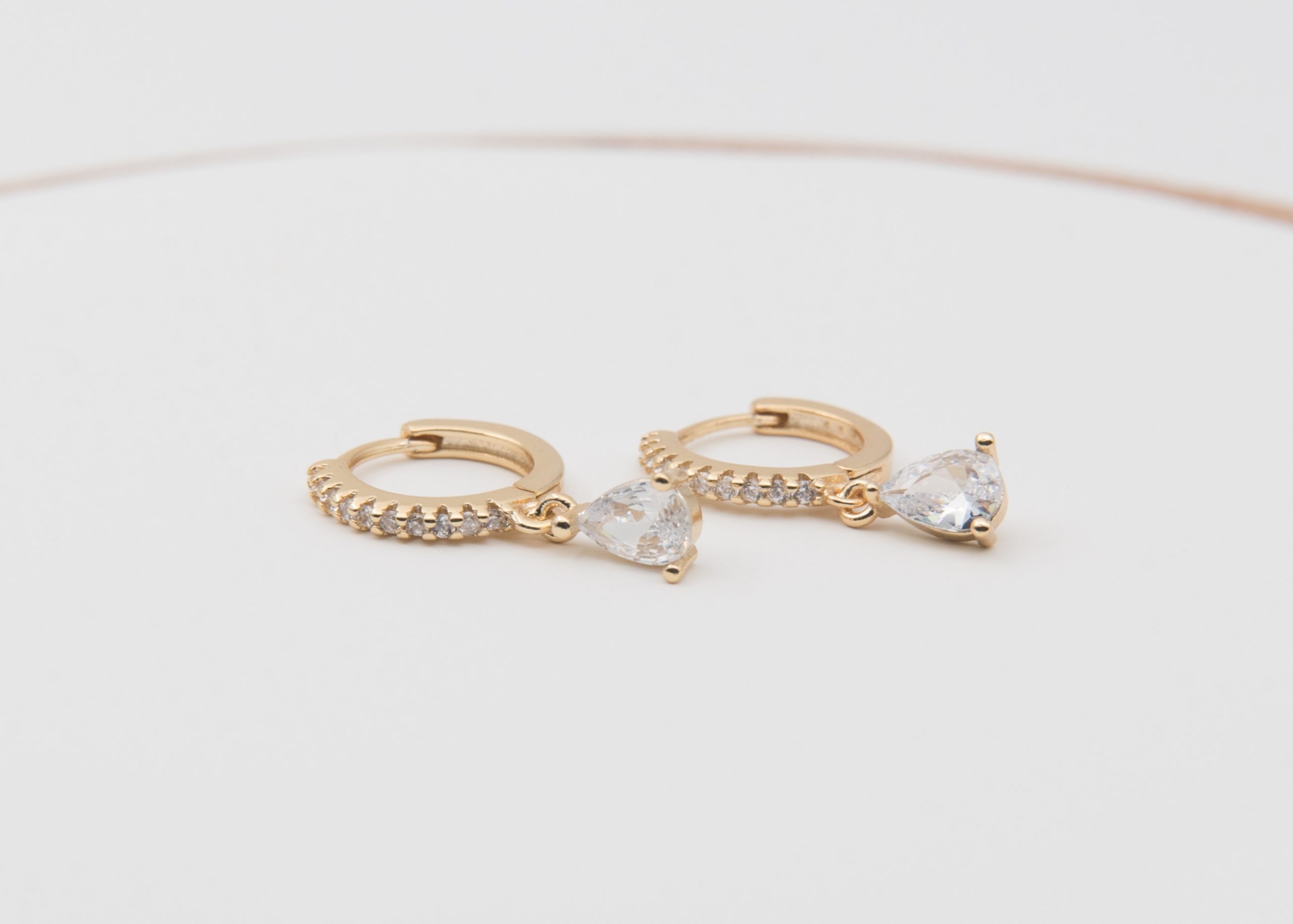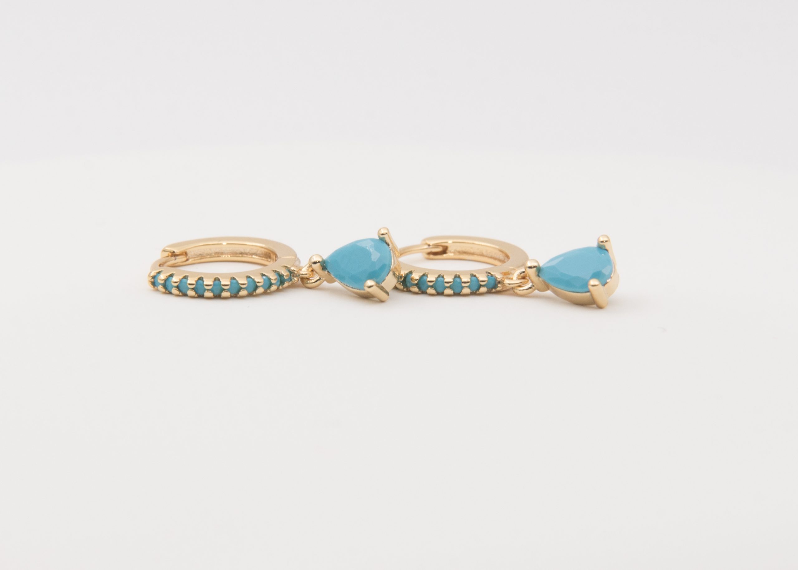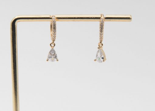 - Petite boucle, au design goutte d’eau, avec des strass et un petit pendentif en pierre de couleur.