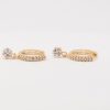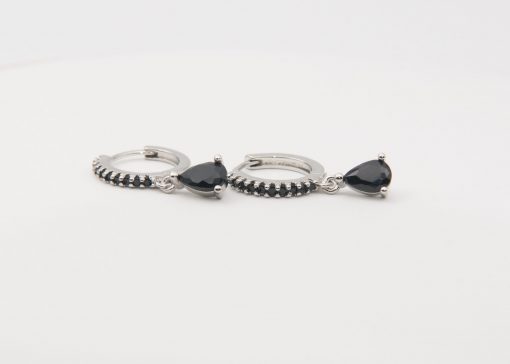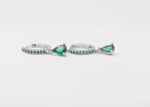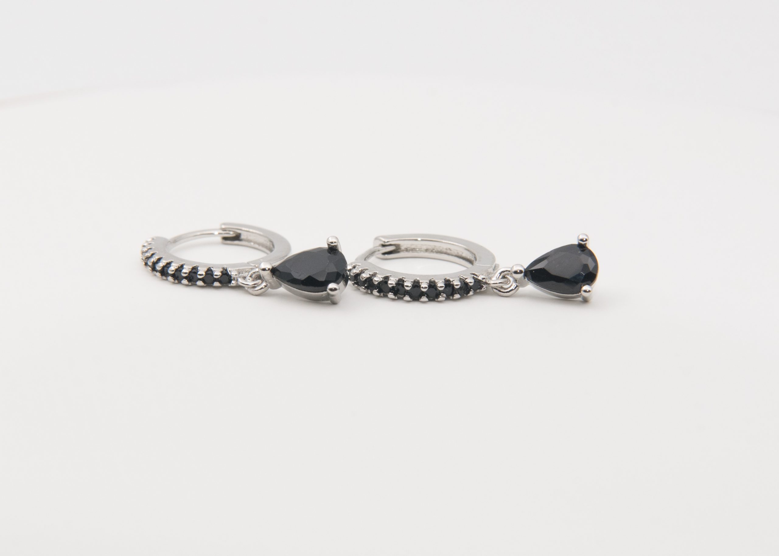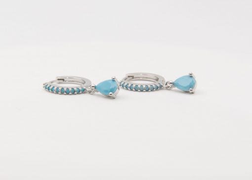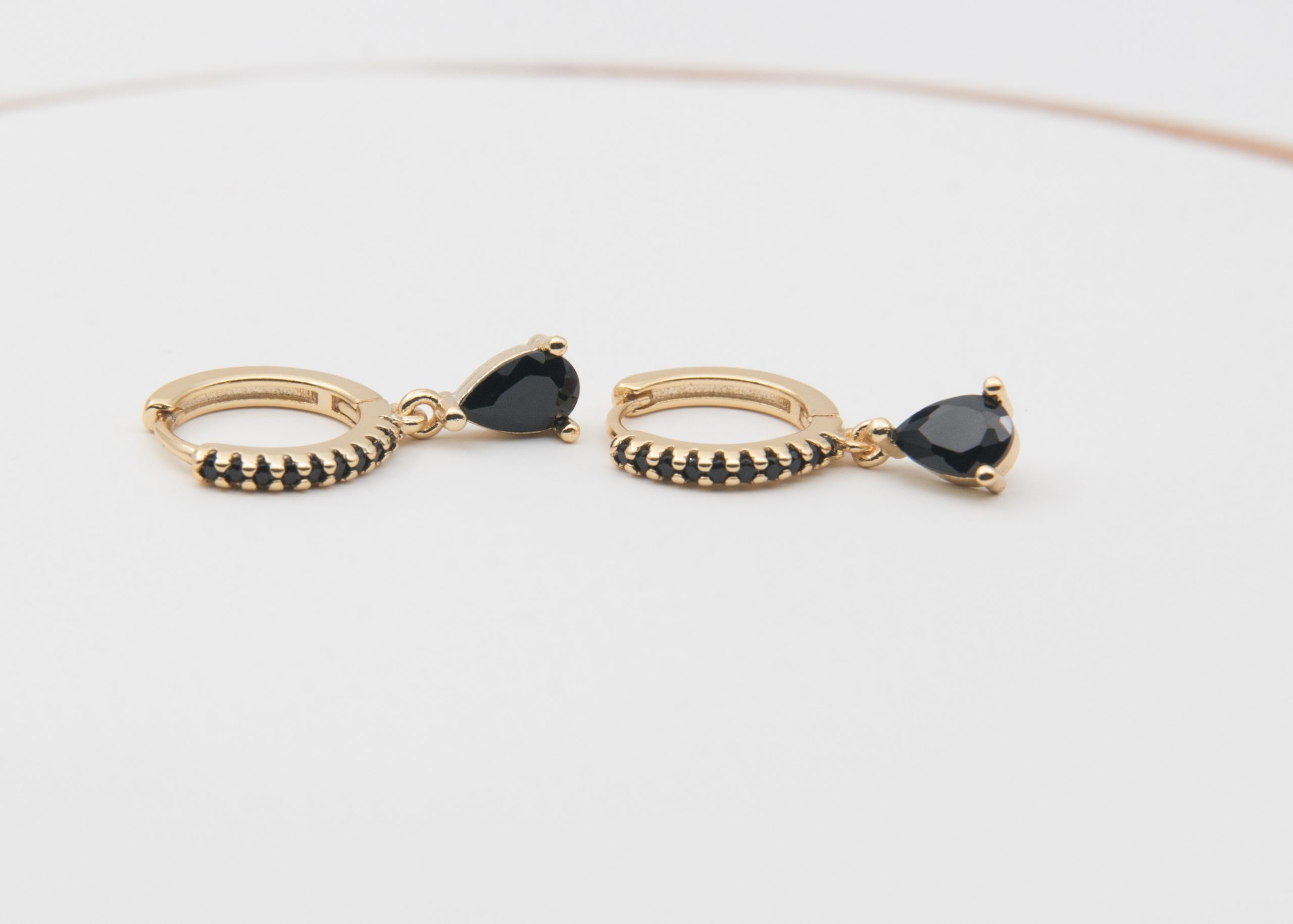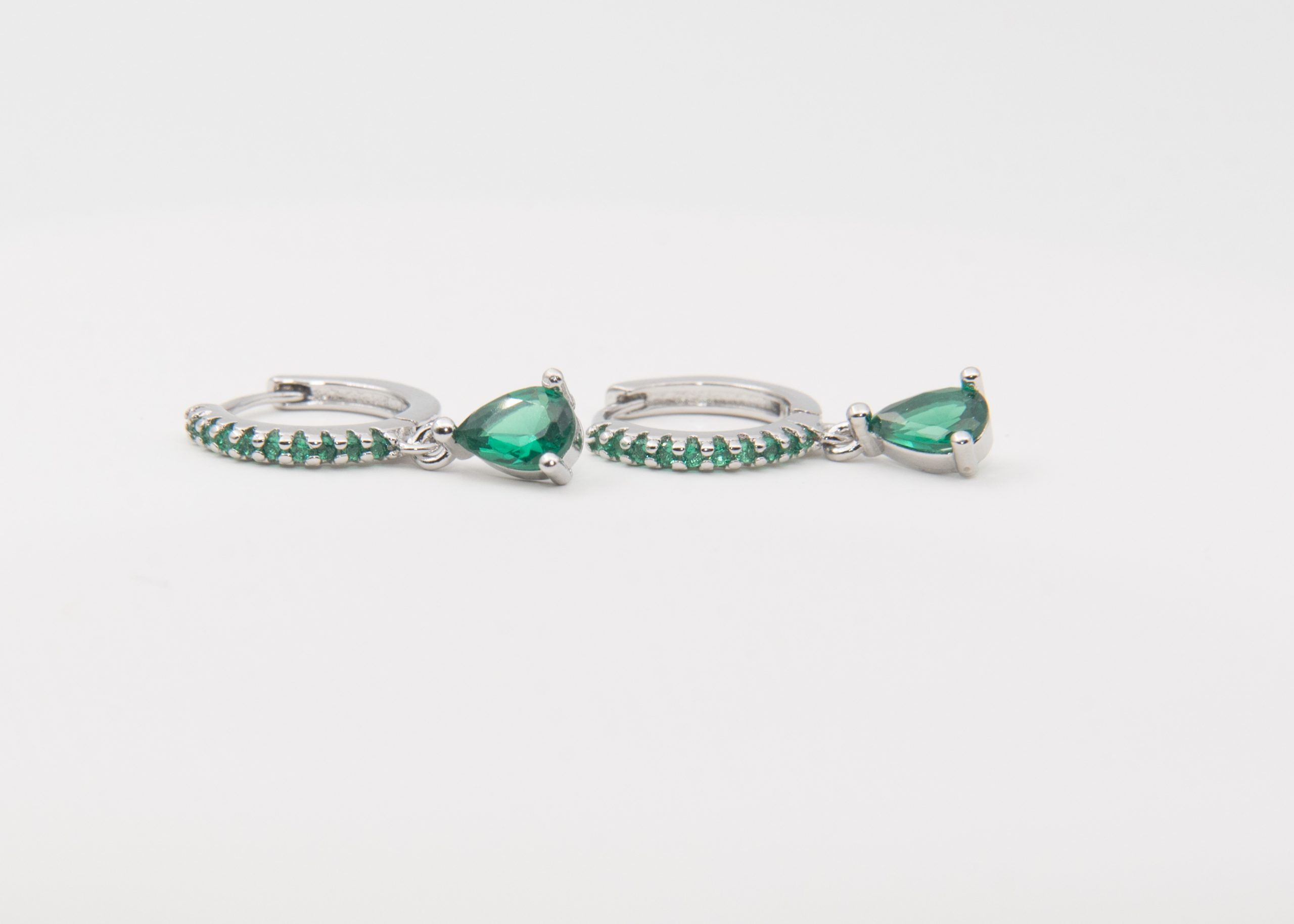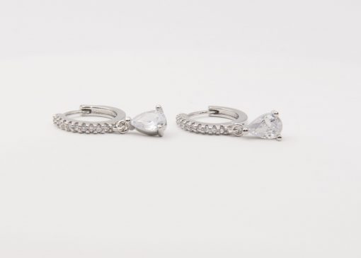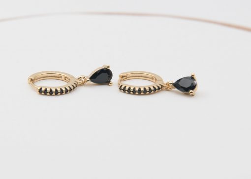 - Petite boucle, au design goutte d’eau, avec des strass et un petit pendentif en pierre de couleur.