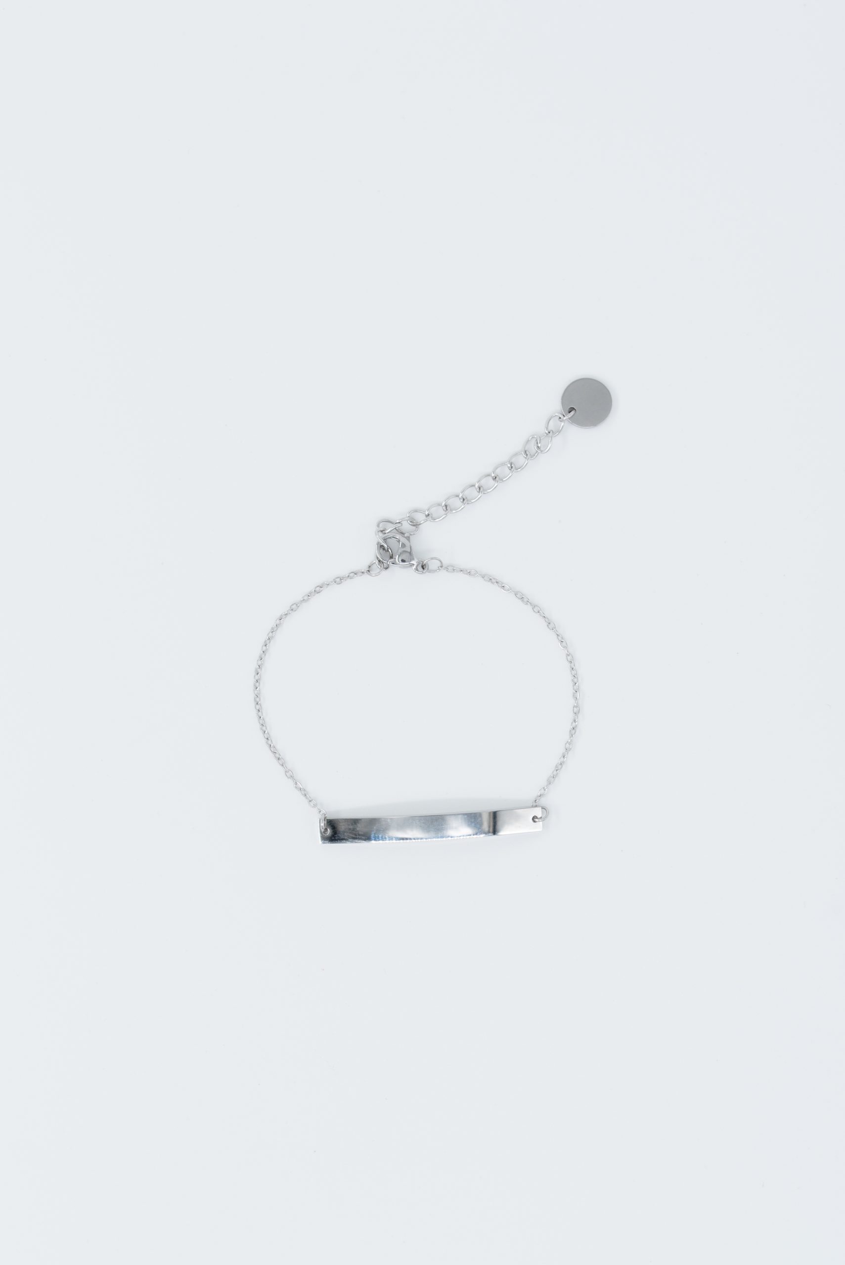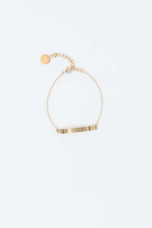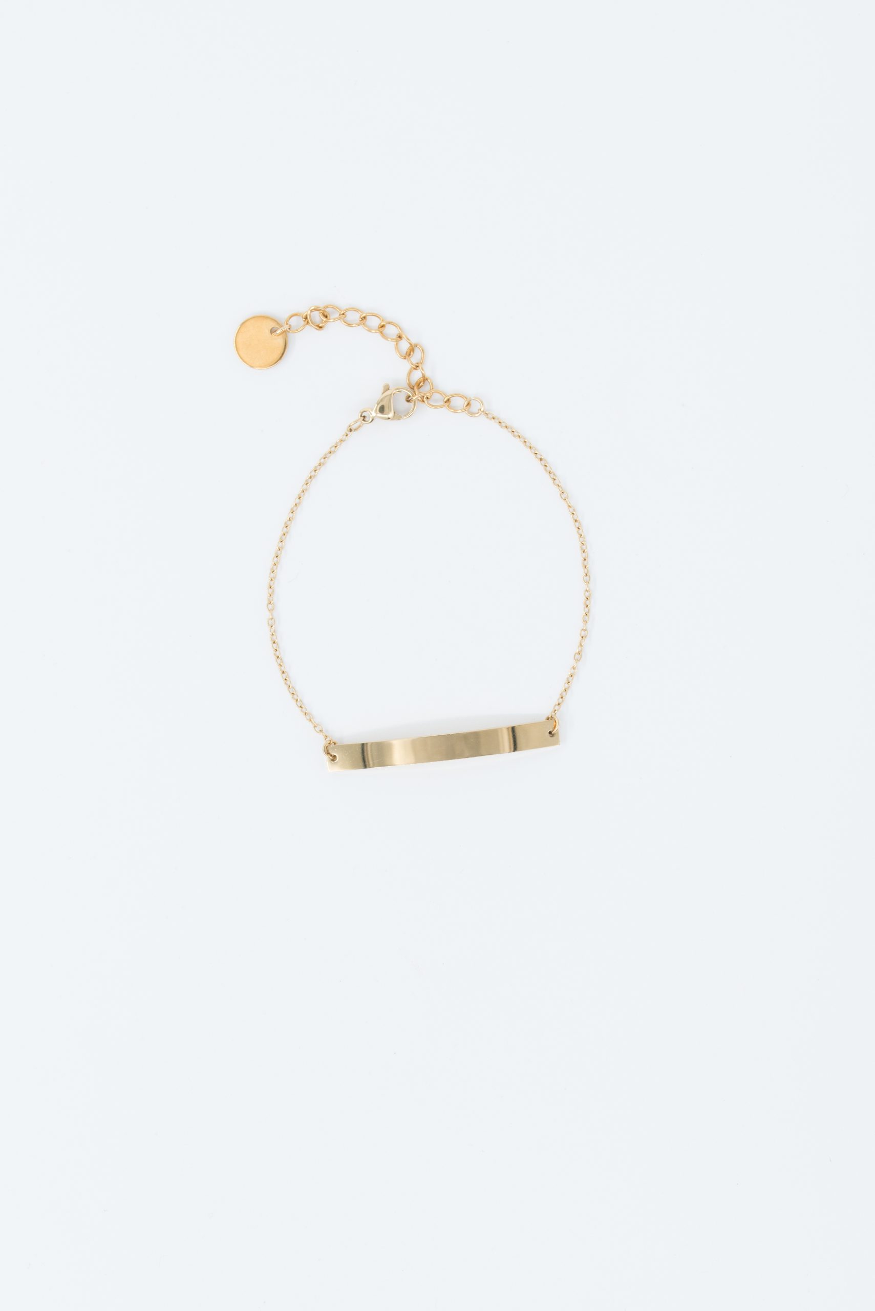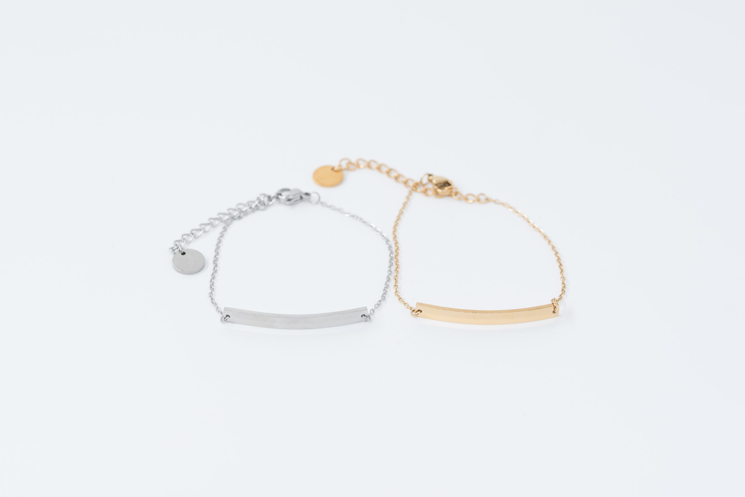 - Bracelet doré ou argenté avec une chaîne très fine encadrant une petite gourmette personnalisable.