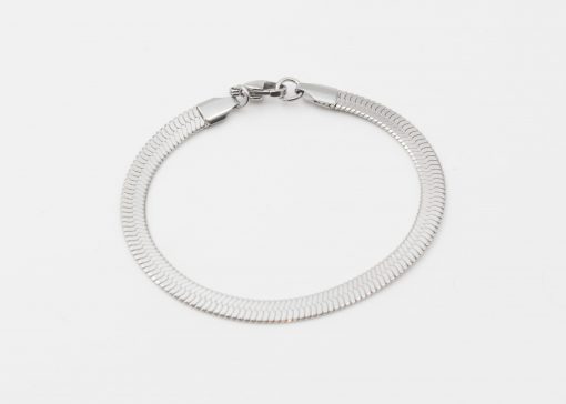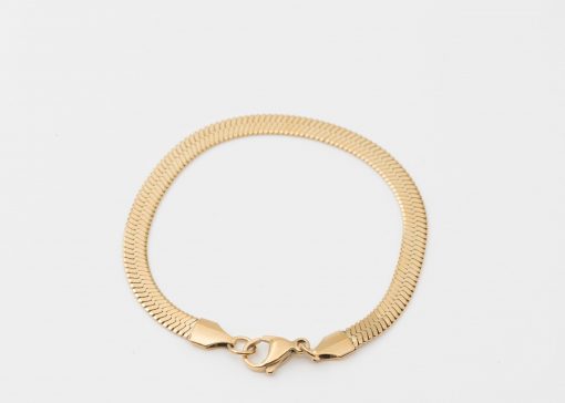 - Bracelet doré, argenté ou rosé avec une chaîne en maille dite » serpent » (plate et lisse).