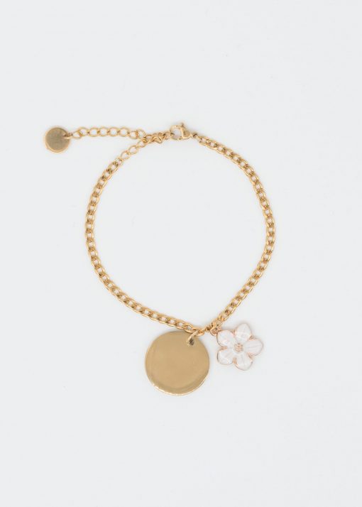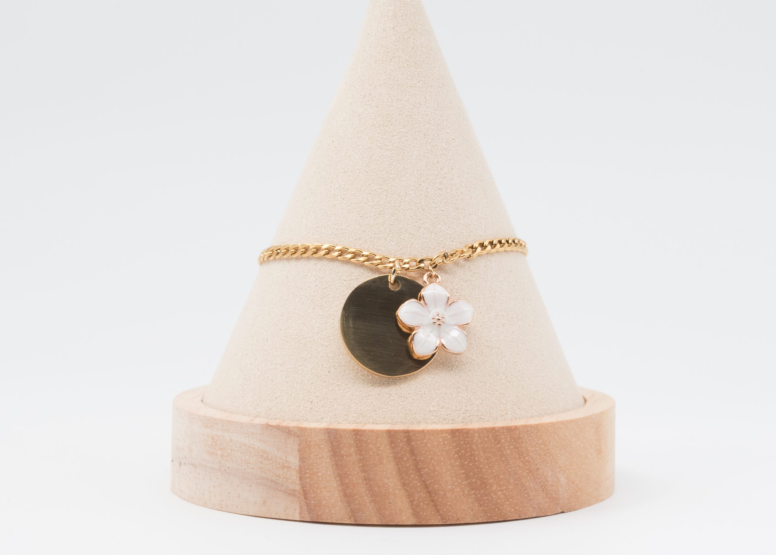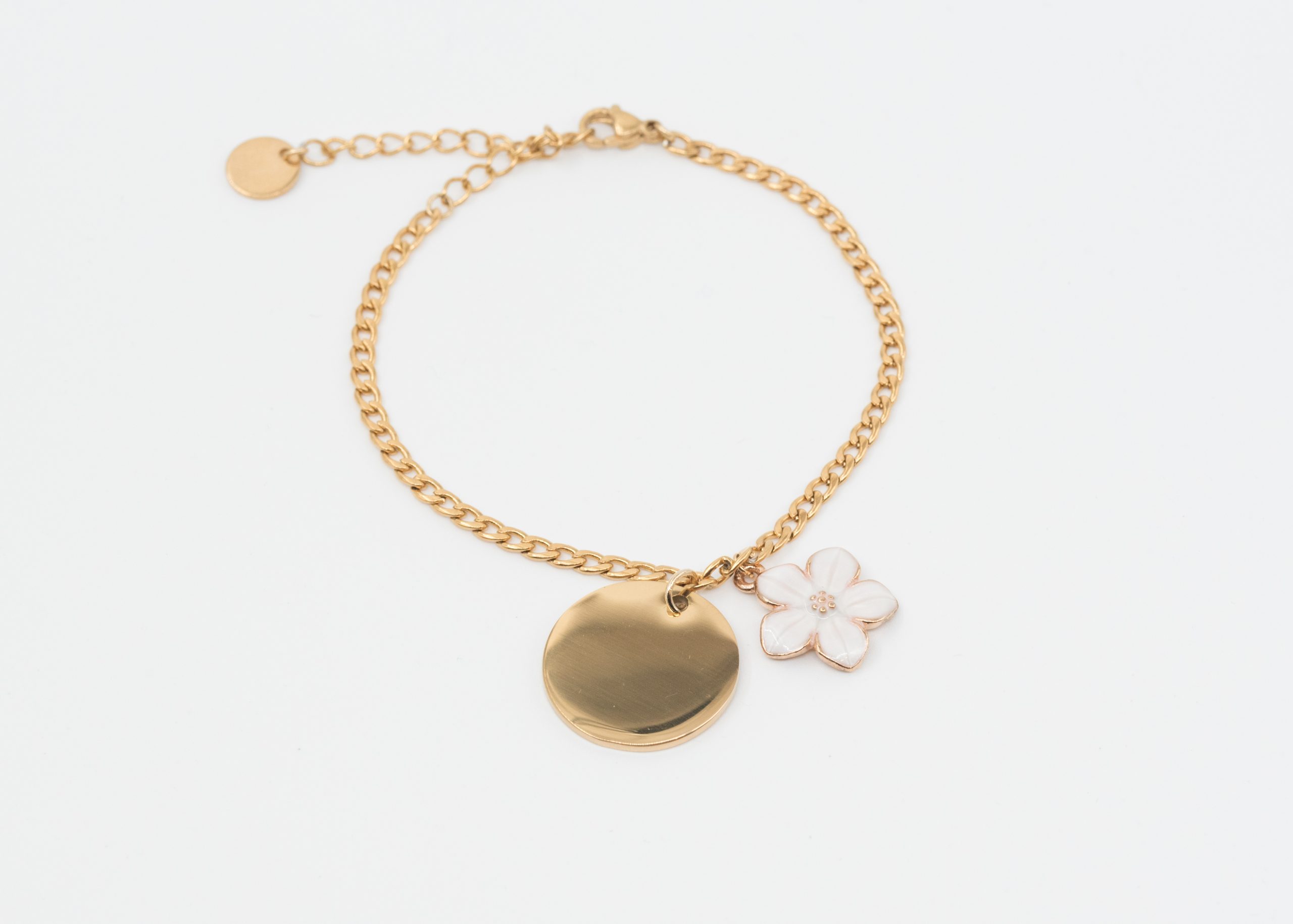 - Une breloque fleur en émail et une grande médaille personnalisable.